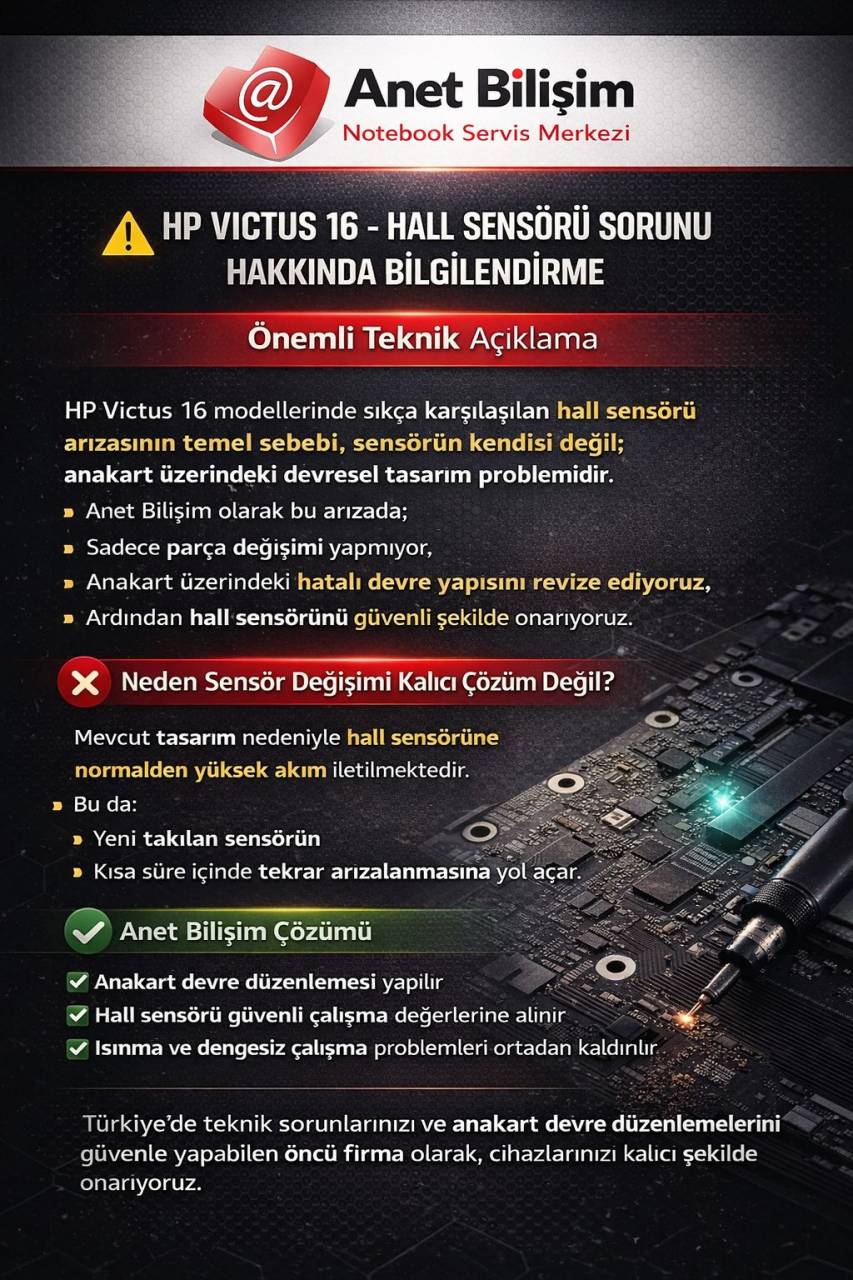 HP Victus 16 modellerinde gözlemlenen hall sensörü arızalarının temel kaynağı, sensör bileşeninden ziyade anakart üzerindeki devresel tasarım hatasıdır.